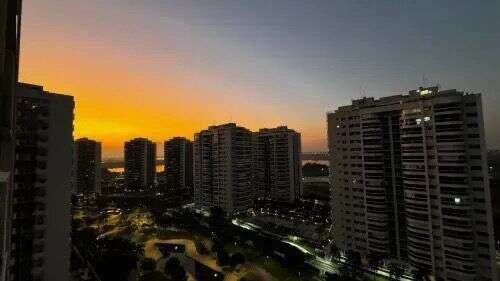 Sol da manhã, andar alto, vista frontal pro parque Ilha Pura, pra lagoa e pro mar.