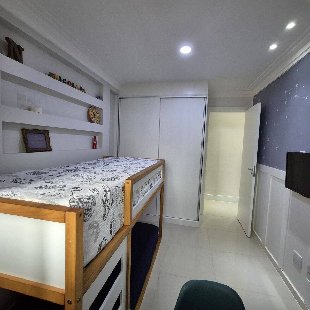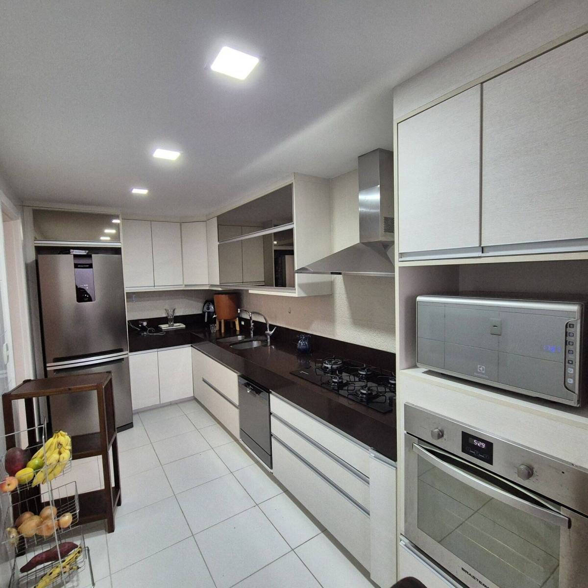 Armários nos quartos, cozinha e banheiros.