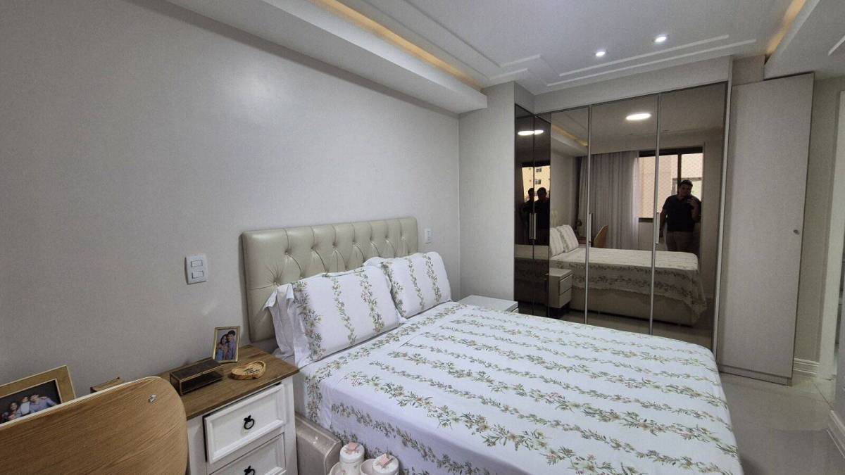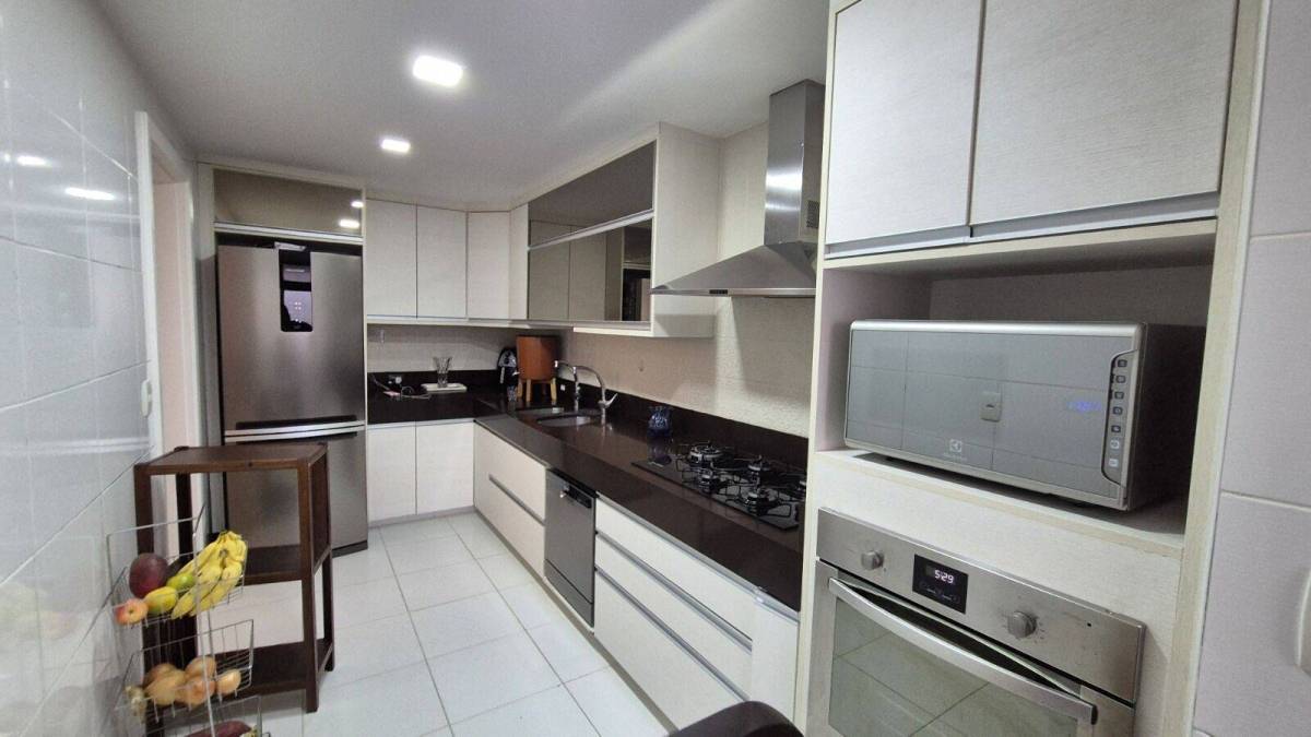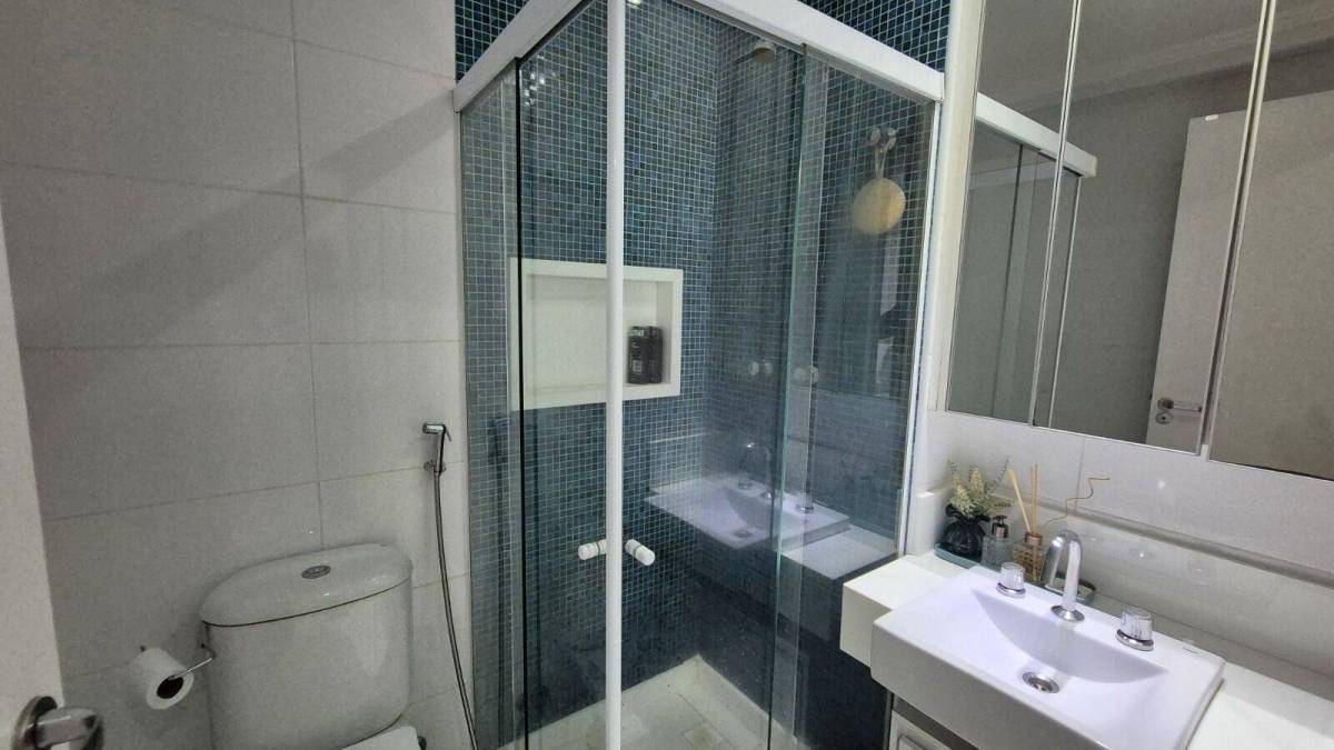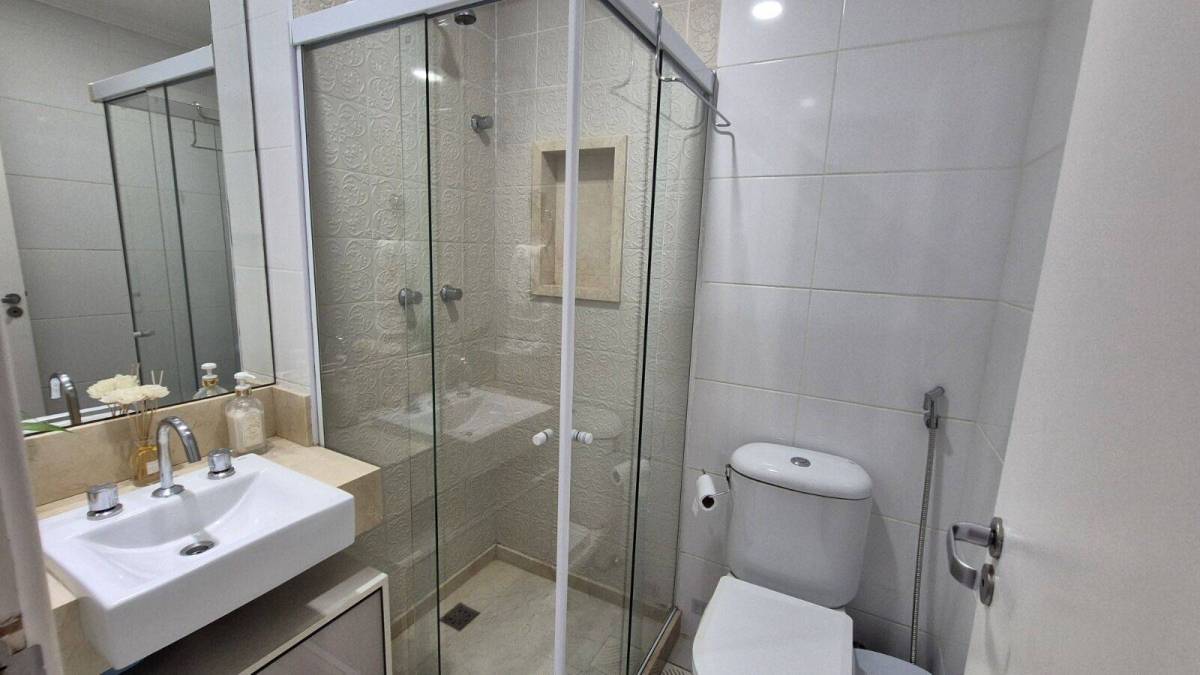 São 93 m² com sala, linda varanda com cortina de vidro, 3 quartos sendo 1 suíte, banheiro social, cozinha planejada com área e banheiro de serviço, 1 vaga coberta.