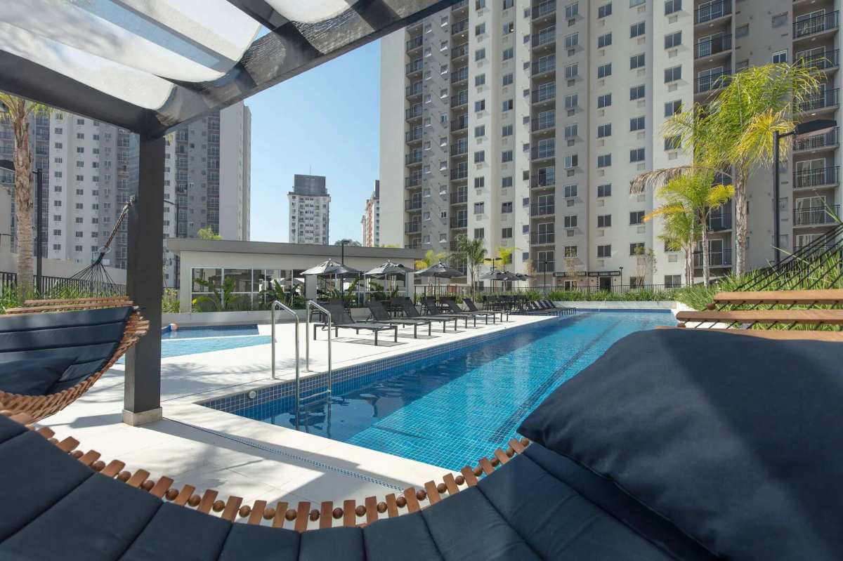 Academia, piscinas adulto e infantil, salão de festas com espaço externo, 2 churrasqueiras com pia de apoio, armários e tv, banheiros, redario na piscina, play, brinquedoteca, mercadinho, biciclétario, vagas para visitantes.