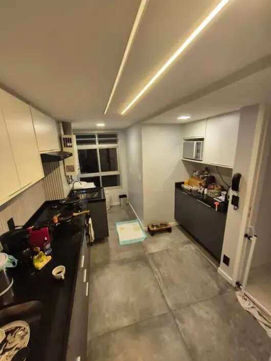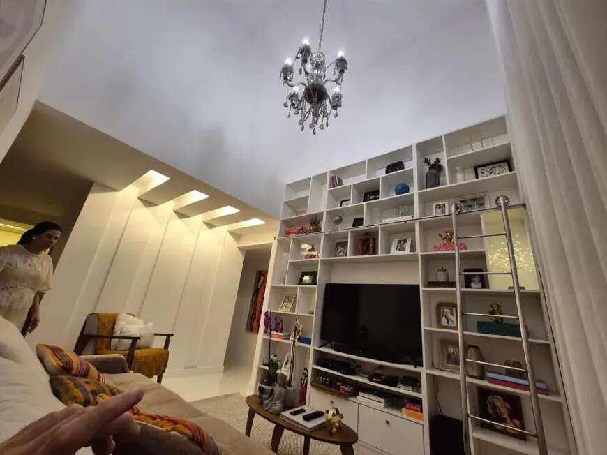 Teto rebaixado e iluminação indireta.