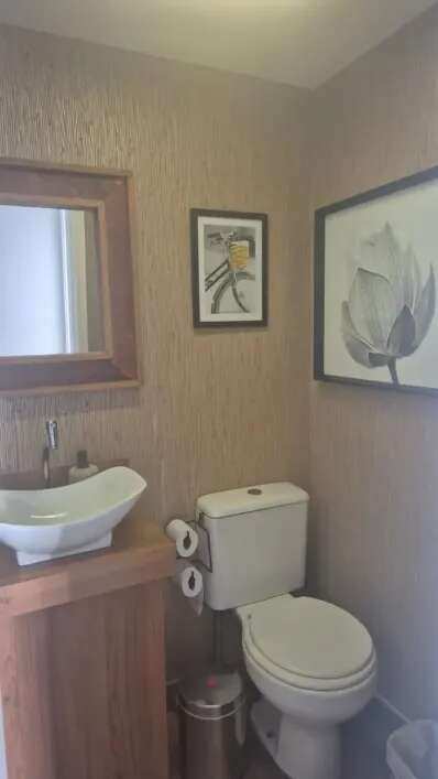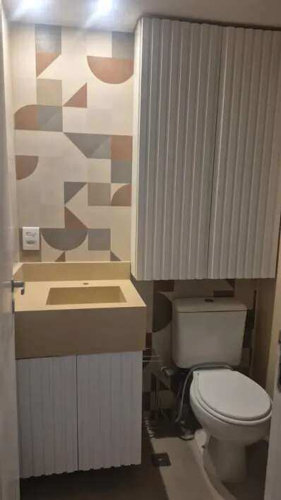 Armários nos quartos, cozinha e banheiros.