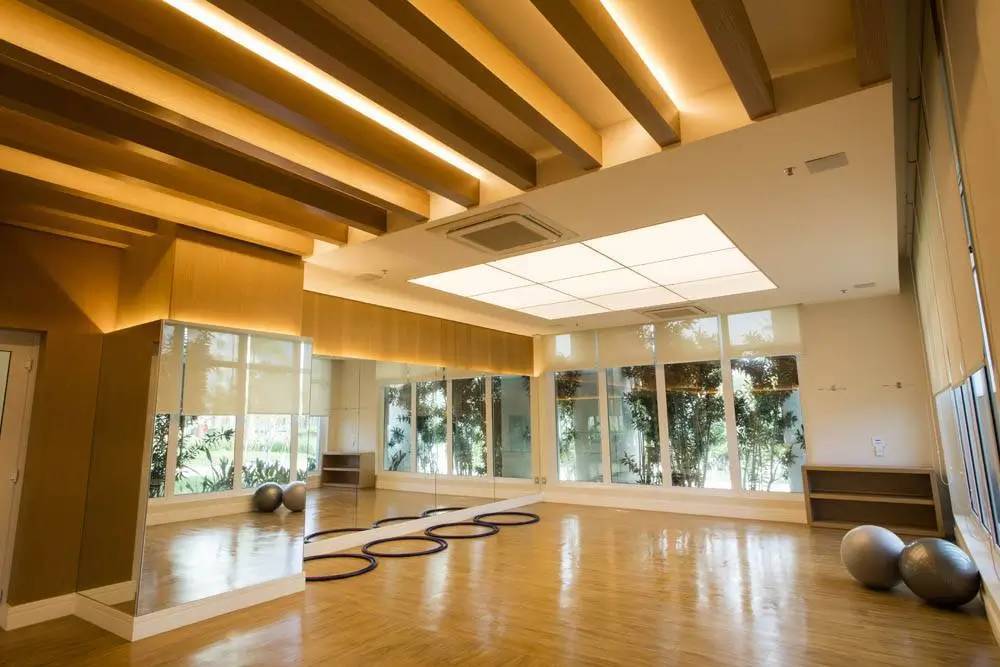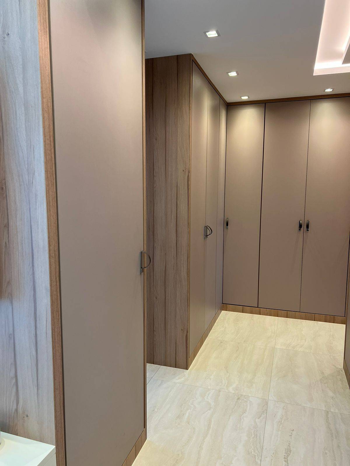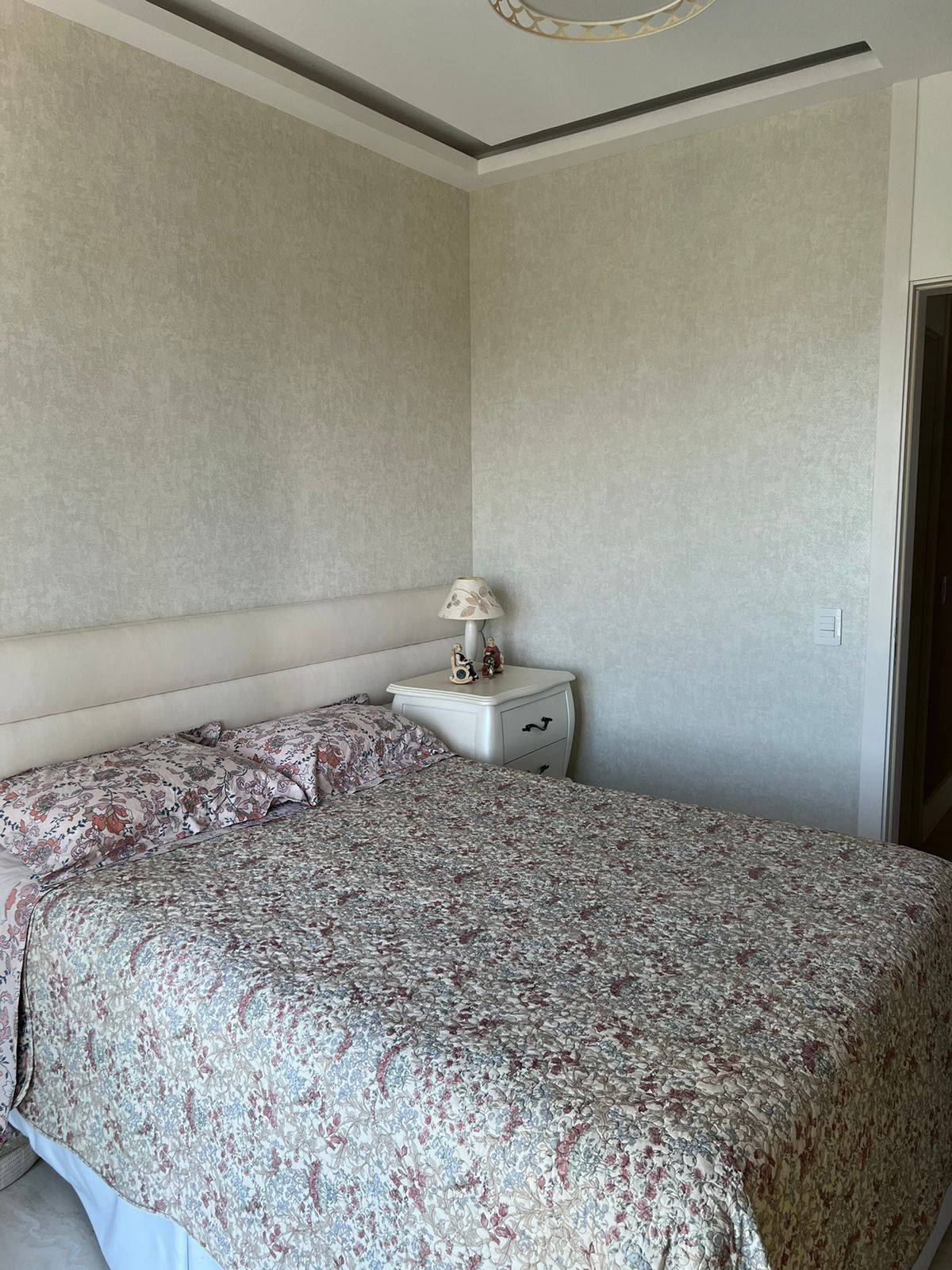 Todo em porcelanato, com teto rebaixado em gesso com projeto de iluminação.