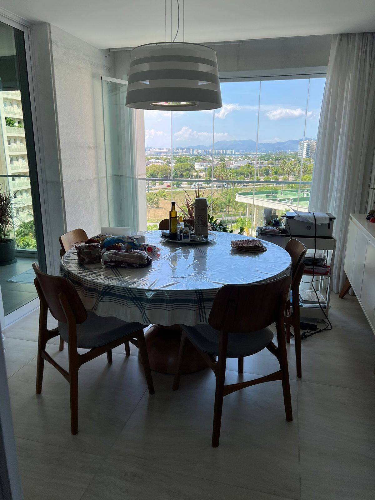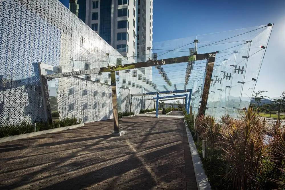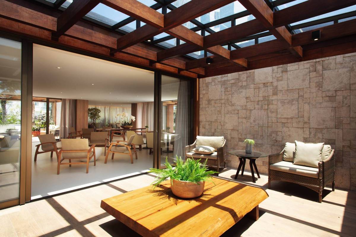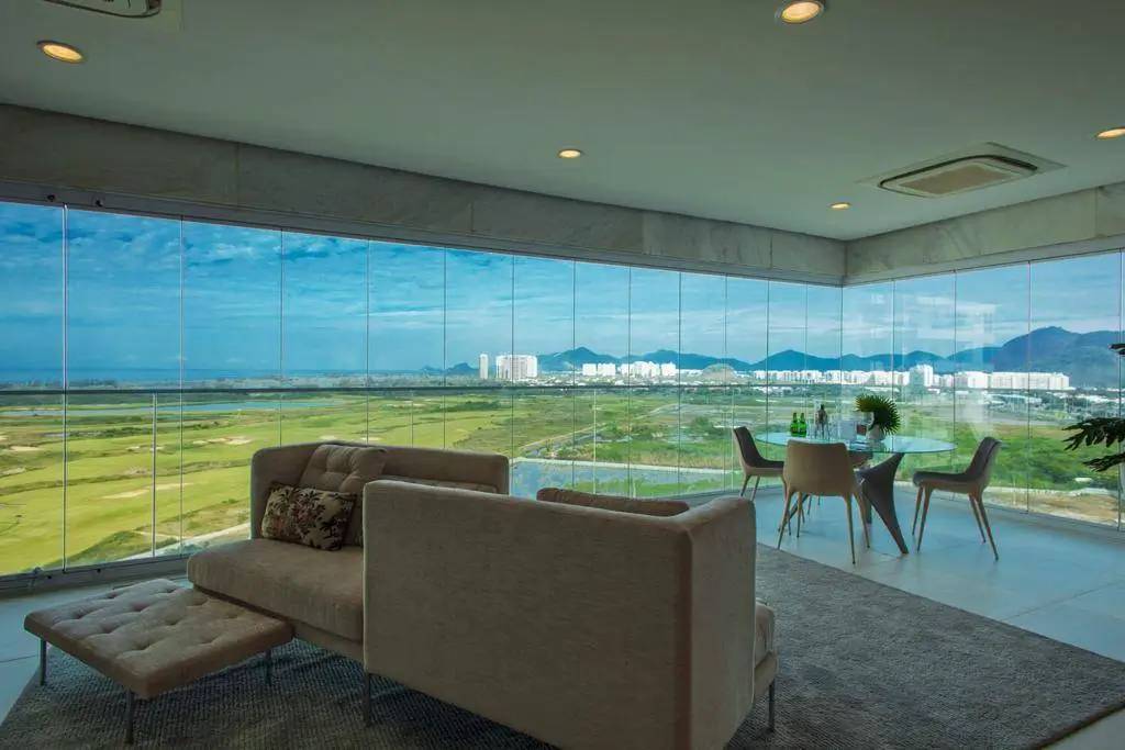 Varanda com cortina de vidro.
