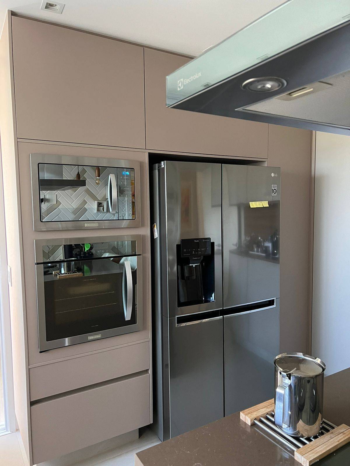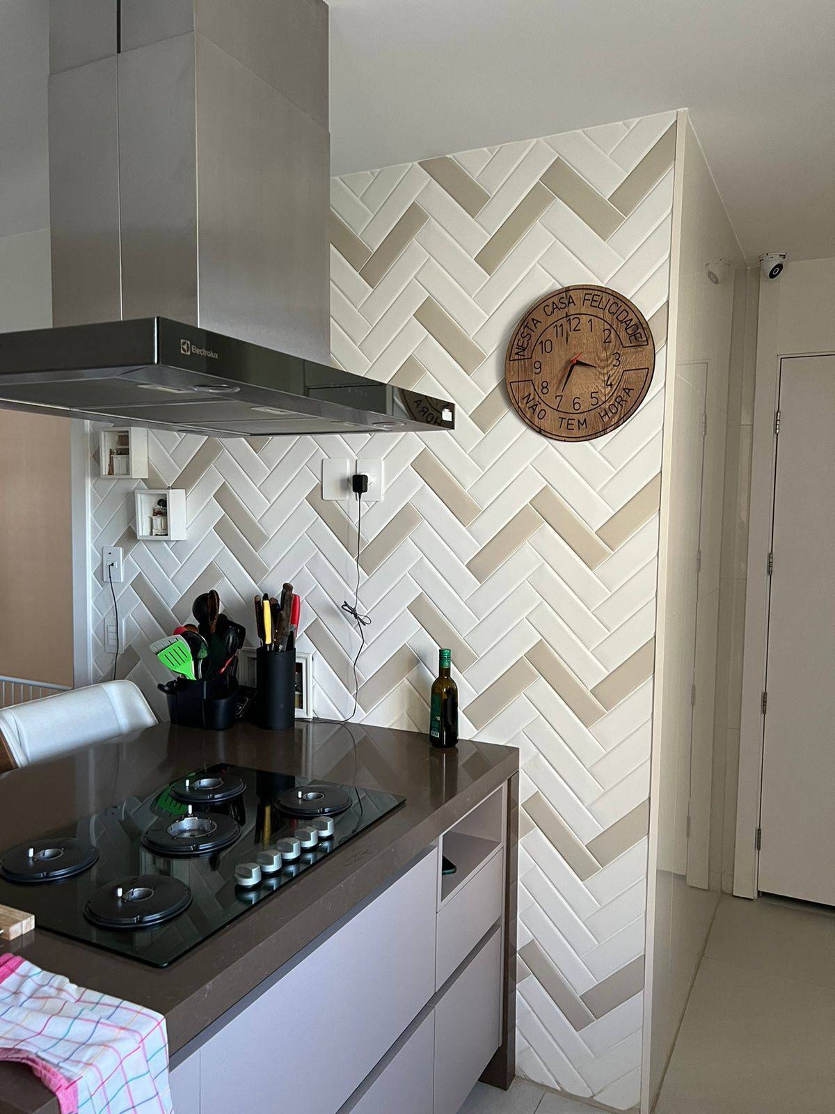 Cozinha com cooktop, coifa, forno embutido e microondas.