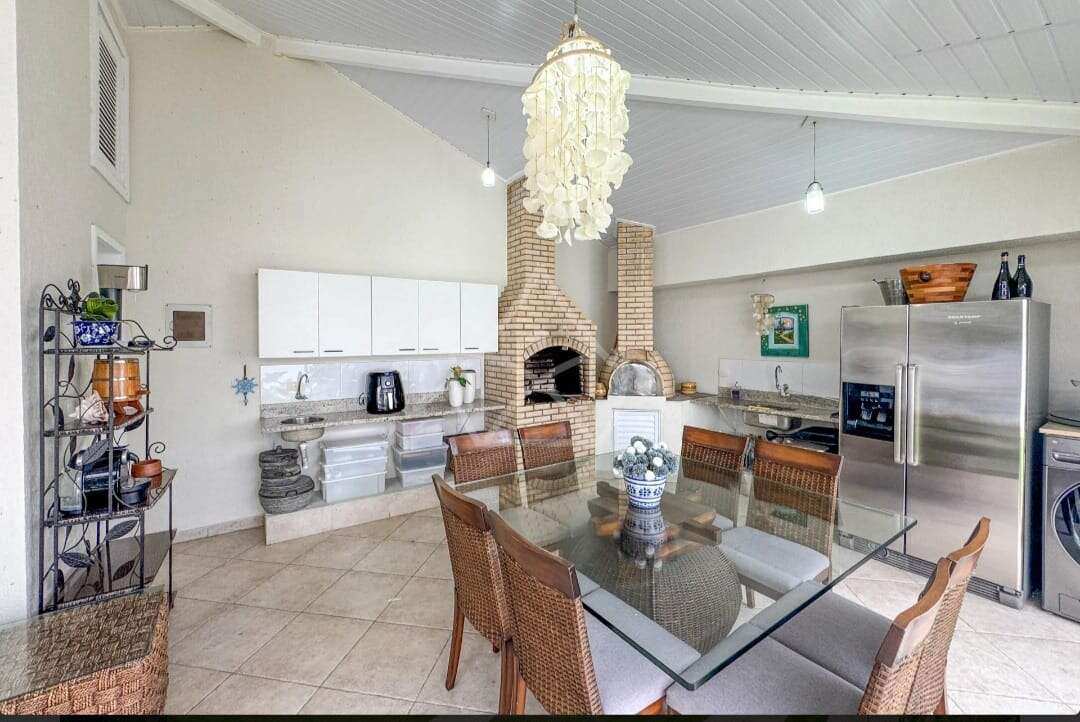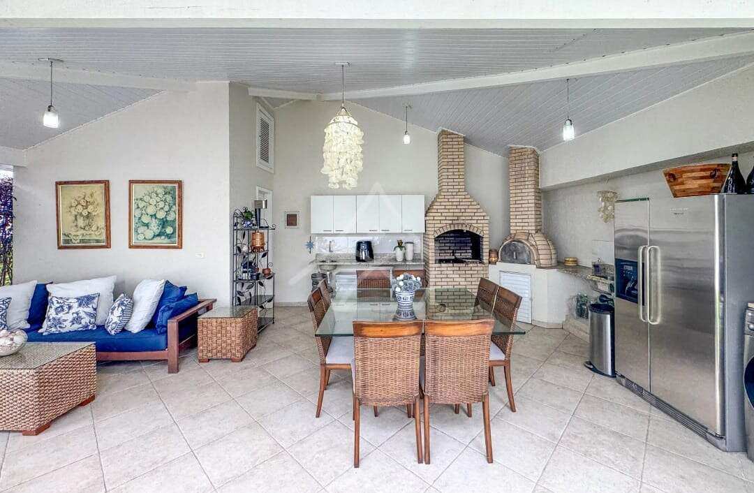 Área externa : Varanda gourmet coberta com churrasqueira, bancada em granito e forno e pizza, piscina grande e banheiro de apoio.