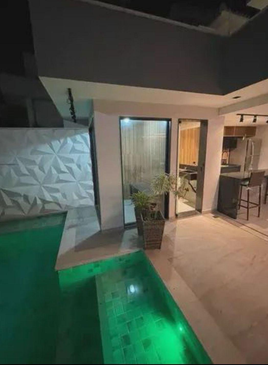 Espaço gourmet com piscina, banheiro, sauna, churrasqueira e pia de apoio.